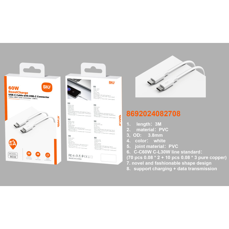 SC33 Cable de carga/datos rapida Type C a Type C 60W 5A de 3 Metros con grosor 3.80mm material PVC.