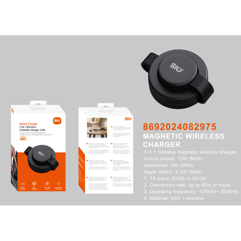MW02 Cargador inalambrico 3in1 para movil, reloj y auriculares.